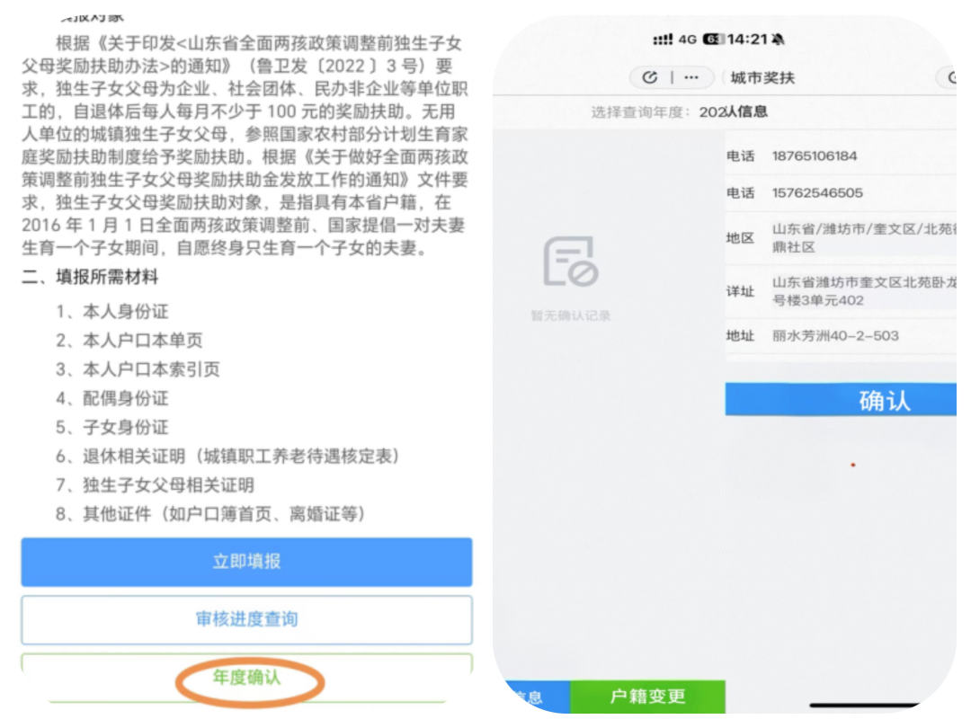 ■ 2023-2025年度线上申报城市奖扶已纳入山东省城市奖扶系统人员,需从手机端进行年度确认:未发生户口迁移的,请点击城市奖扶—年度确认办理;若户口发生了迁移,请填写变更后的户籍地,并上传现户籍地址户口本单页后再进行确认提报(迁至青岛市或从青岛市迁入我区的,需在原申请地退出后重新申报)。未进行年度确认的人员无法进入花名册将停发扶助金。往年线下申报的人员无需重复申报,但需配合社区居委会做好年度确认工作。