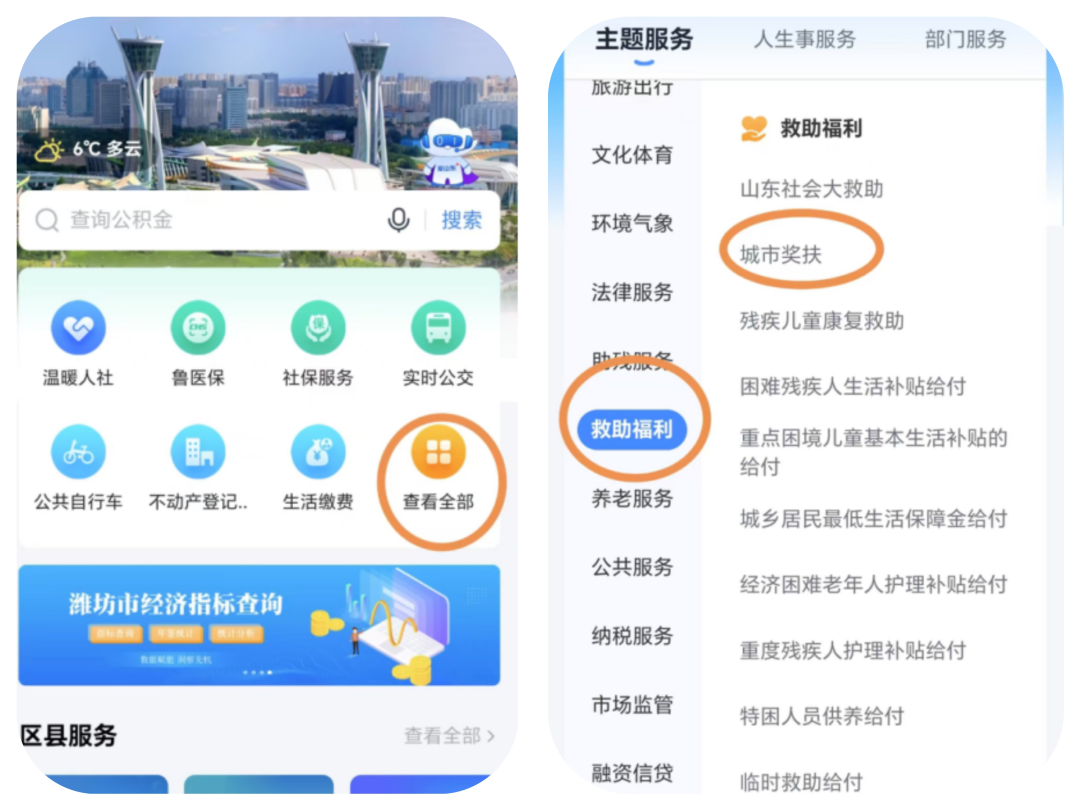 进入“爱山东”APP首页,依次点击“查看全部——救助福利——城市奖扶”选项,根据要求填写相关内容并上传证明材料。