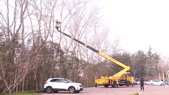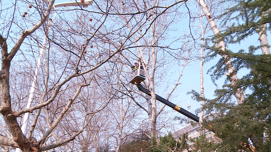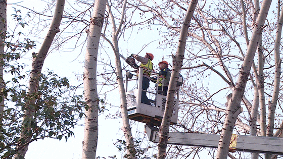 工作人员正对道路一侧的杨树开展修剪作业
