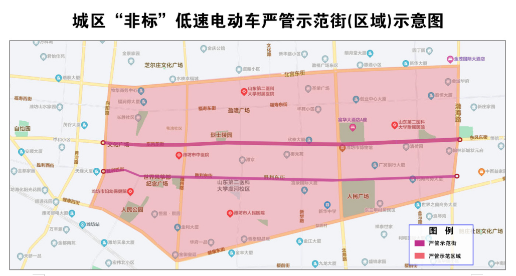 二、自2026年5月10日起,设立“非标”低速电动车严管示范街:胜利街(渤海路至向阳路段)、东风街(渤海路至向阳路段);自2026年10月1日起,设立“非标”低速电动车严管示范区域:东至渤海路(含)、西至向阳路(含)、南至健康街(含)、北至北宫街(含)。