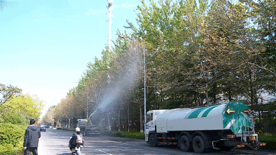 我们调配多辆雾炮车,在重点路段巡回作业,重点盯紧每天10点到15点飞絮高发时段。同时根据作业现场,灵活调整喷雾的角度和水压,在保障治絮效果的同时,最大限度减少对市民正常出行的影响。