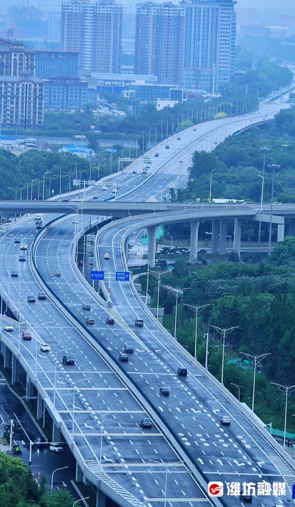 北海路是潍坊市城区纵贯南北的标志性大道,一定程度上彰显了潍坊市的城市形象。而位于这条路上的北海路通亭街立交桥和开元立交桥,更是城区著名的地标。秋高气爽、风轻云淡,从空中俯瞰,北海路通亭街立交桥如盘卧在大地上的巨龙,气势雄伟。开元立交桥则如振翅欲飞的蝴蝶,造型绝美。两座矗立在北海路上的立交桥,各自将不同的道路串联延伸,交织出一幅交通枢纽的壮美画卷。