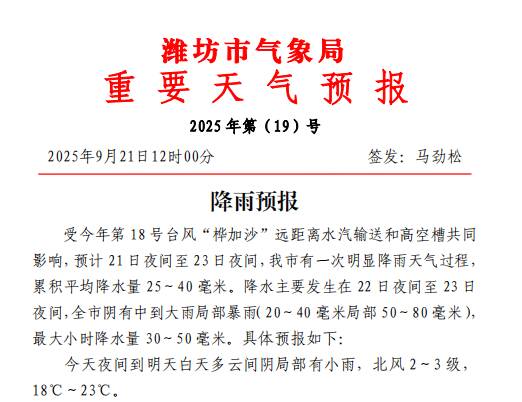 受今年第18号台风“桦加沙”远距离水汽输送和高空槽共同影响,预计21日夜间至23日夜间,潍坊有一次明显降雨天气过程,累积平均降水量25~40毫米。降水主要发生在22日夜间至23日夜间,全市阴有中到大雨局部暴雨(20~40毫米局部50~80毫米),最大小时降水量30~50毫米。