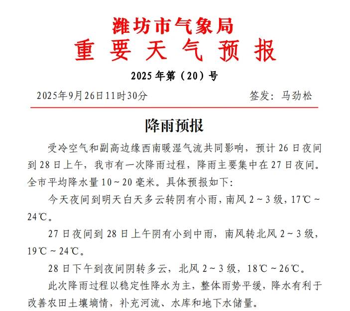 9月26日,潍坊市气象局发布降雨预报。受冷空气和副高边缘西南暖湿气流共同影响,预计26日夜间到28日上午,潍坊有一次降雨过程,降雨主要集中在27日夜间。潍坊全市平均降水量10~20毫米。具体预报如下:今天夜间到明天白天多云转阴有小雨,南风2~3级,17℃~24℃。27日夜间到28日上午阴有小到中雨,南风转北风2~3级,19℃~24℃。 28日下午到夜间阴转多云,北风2~3级,18℃~26℃。