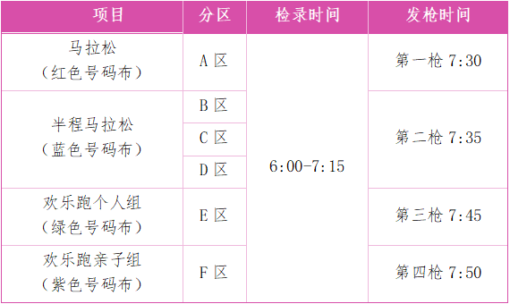 根据选手报名人数和场地规划等情况,为保证赛事安全、有序,组委会决定采取分区检录、分枪起跑的发令方式,具体检录与发令时间如下: