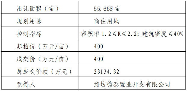 据了解,2024-G45号地块位于宝通东街以北、光电路以东,宗地面积37112平方米(55.668亩),竞得人潍坊德泰置业开发有限公司。