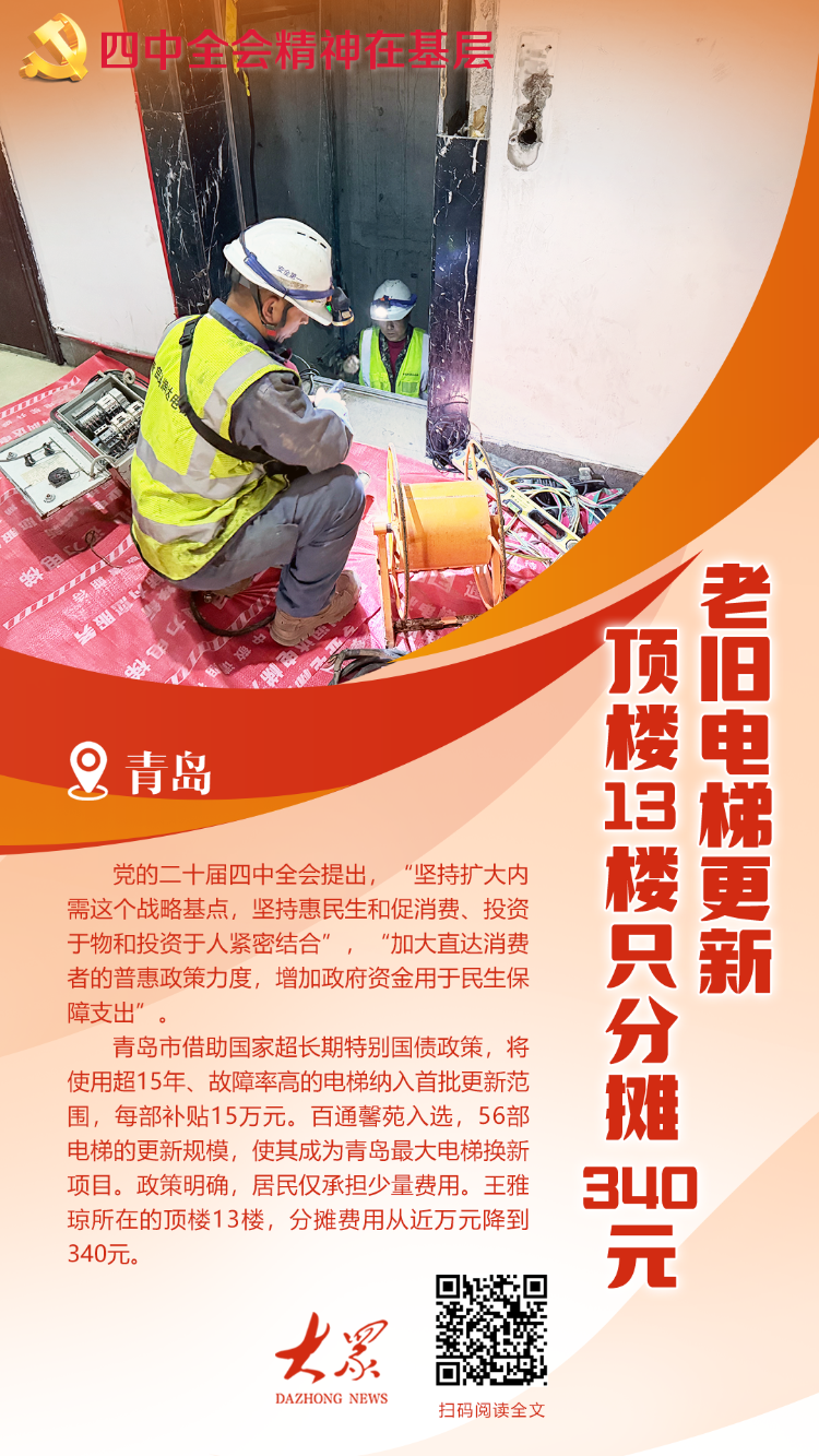青岛市借助国家超长期特别国债政策,将使用超15年、故障率高的电梯纳入首批更新范围,每部补贴15万元。百通馨苑入选,56部电梯的更新规模,使其成为青岛最大电梯换新项目。政策明确,居民仅承担少量费用。王雅琼所在的顶楼13楼,分摊费用从近万元降到340元。