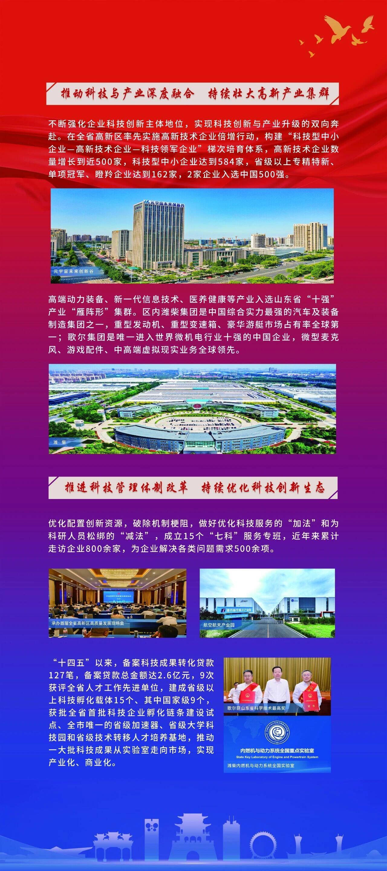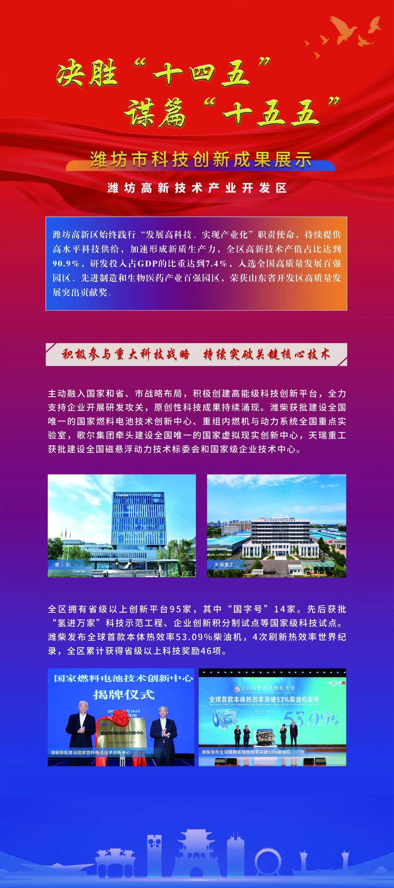 潍坊高新区高新技术产值占比达到90.9%,研发投入占GDP的比重达到7.4%,入选全国高质量发展百强园区、先进制造和生物医药产业百强园区,荣获山东省开发区高质量发展突出贡献奖。积极创建高能级科创平台,全区拥有省级以上创新平台95家,其中“国字号”14家,先后获批“氢进万家”科技示范工程、企业创新积分制试点等国家级科技试点,获得省级以上科技奖励46项。在全省高新区率先实施高新技术企业倍增行动,高新技术企业数量增长到近500家,科技型中小企业达到584家,省级以上专精特新、单项冠军、瞪羚企业达到162家,2家企业入选中国500强。推进科技管理体制改革,成立15个“七科”服务专班,近三年走访企业800余家,解决各类问题需求500余项,建成省级以上科技孵化载体15个,其中国家级9个,获批全省首批科技企业孵化链条建设试点。