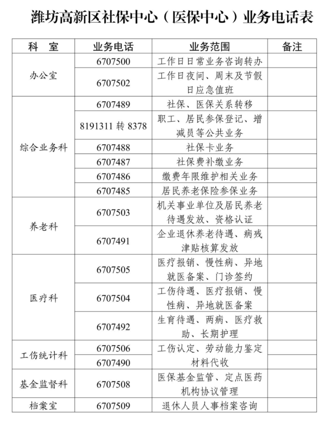 附件:潍坊高新区社保中心(医保中心)业务电话表