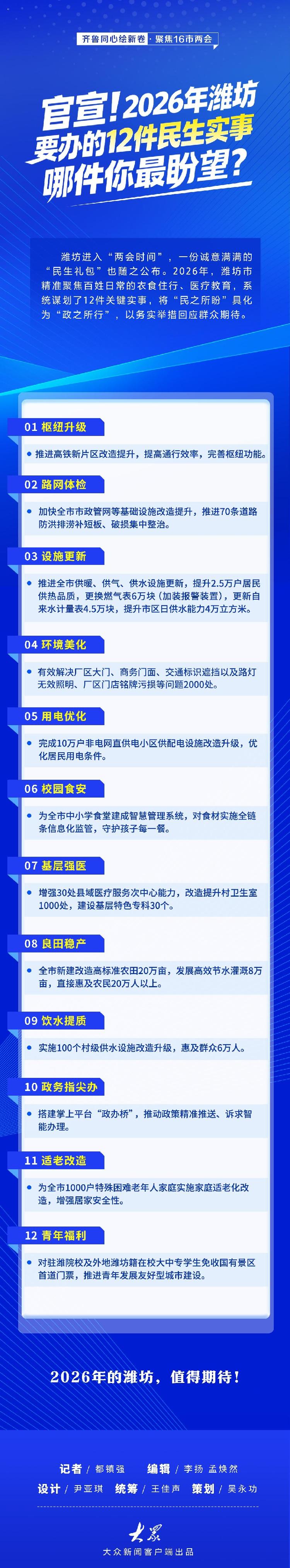 2026年全省16市“两会”陆续启幕,这是各地政治生活中的一件大事,也是展现一年来发展成果、擘画未来蓝图的重要时刻。大众新闻客户端山东频道策划推出“齐鲁同心绘新卷·聚焦16市两会”大型融媒专题,通过前后方联动、可视化呈现、短视频传播等方式,全方位、多角度报道各市“两会”盛况。