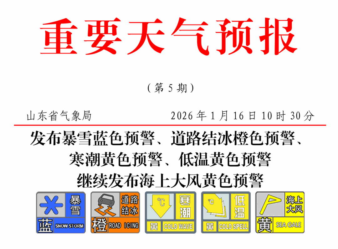 山东省气象台于1月16日10时30分发布暴雪蓝色预警、道路结冰橙色预警、寒潮黄色预警、低温黄色预警,继续发布海上大风黄色预警。