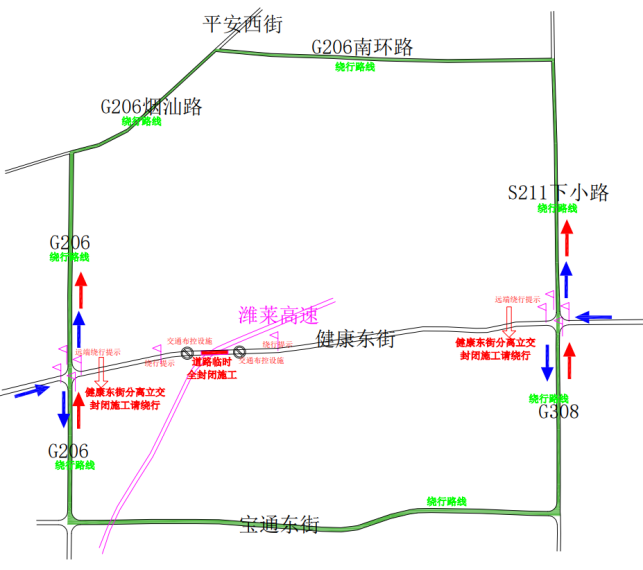 此路段主要施工内容为荣潍高速跨健康东街门洞拆除。封闭施工期间,通过此路段的车辆、行人、非机动车请根据交通标志提示减速慢行,确保安全。沿线各企事业单位和居民请根据本公告,提前做好生产生活准备,注意交通安全。因施工给您造成的不便,敬请谅解。