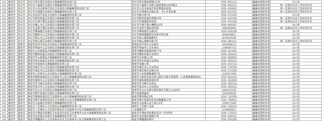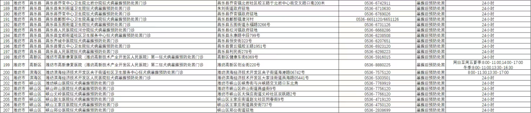 无论是家养还是流浪动物致伤后,一定要第一时间到潍坊市狂犬病暴露预防处置门诊进行规范伤口处置、疫苗接种与被动免疫制剂注射。截至2026年1月,全市现有犬伤门诊205处、破伤风接种室2处,具体如下。