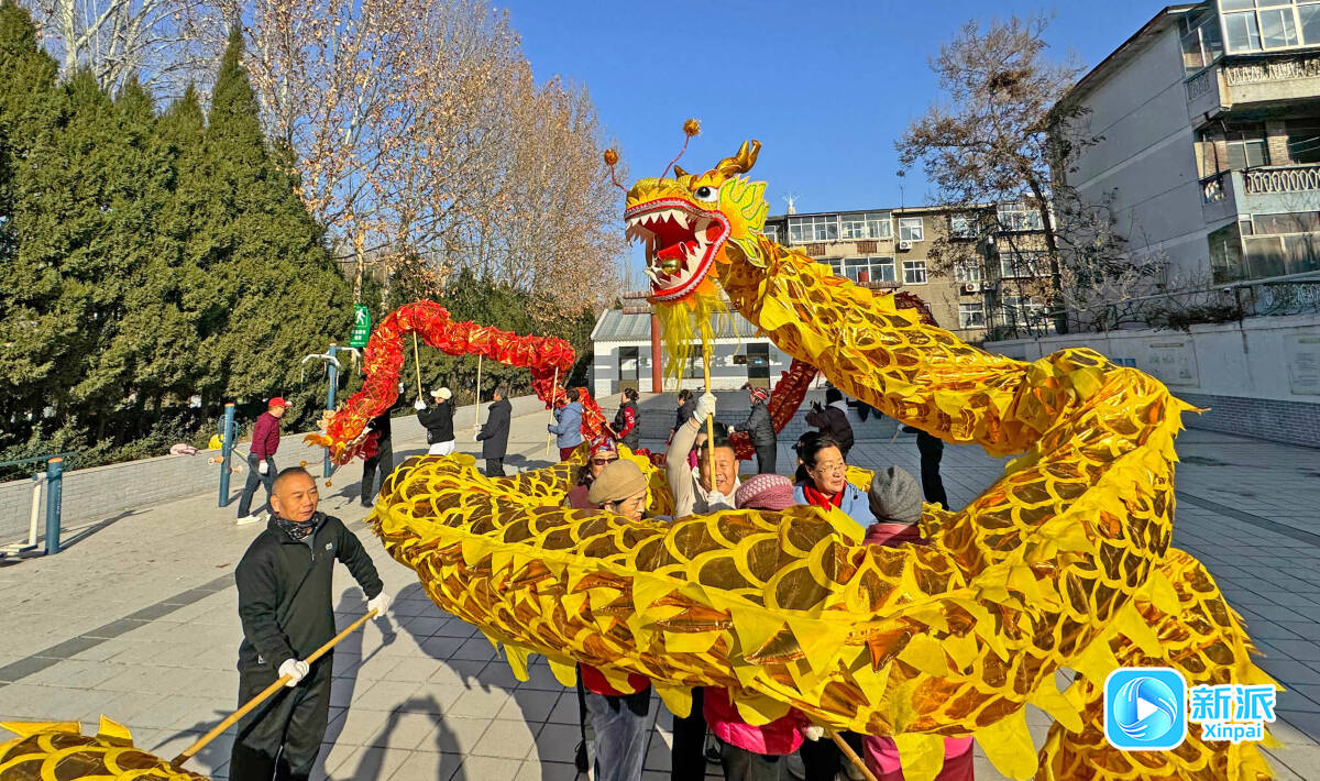 在奎文区东关街道工福街社区,居民们在舞龙。