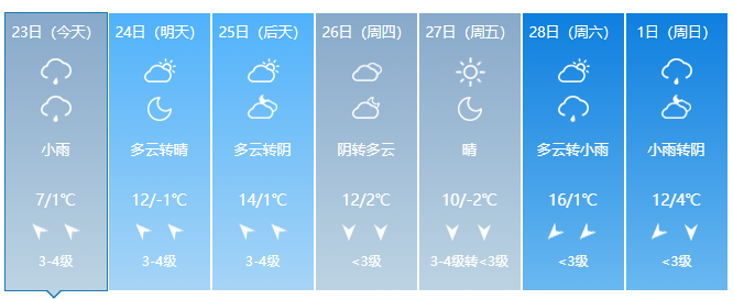 23日白天,天气多云转阴局部有零星小雨,北风转南风3~4级,最低气温-1℃,最高气温7℃。森林火险气象等级三级,中度危险。
