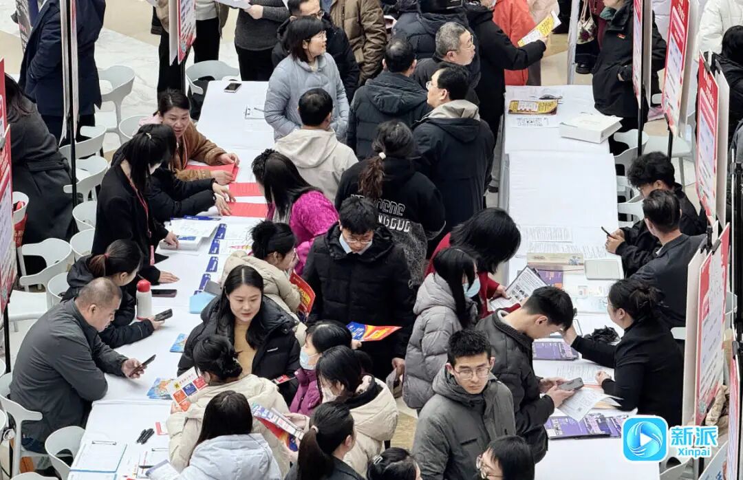 2月24日,在城区鸢飞路与福寿东街交叉口一商场,求职者在招聘会现场寻找适合自己的工作岗位。