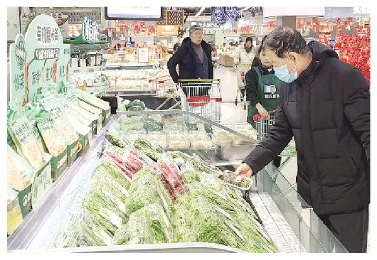 正在买菜的张先生说,现在春菜供应充足,菜篮子格外丰富,他买了一盒面条菜,打算裹上玉米面蒸着吃,美味又健康。