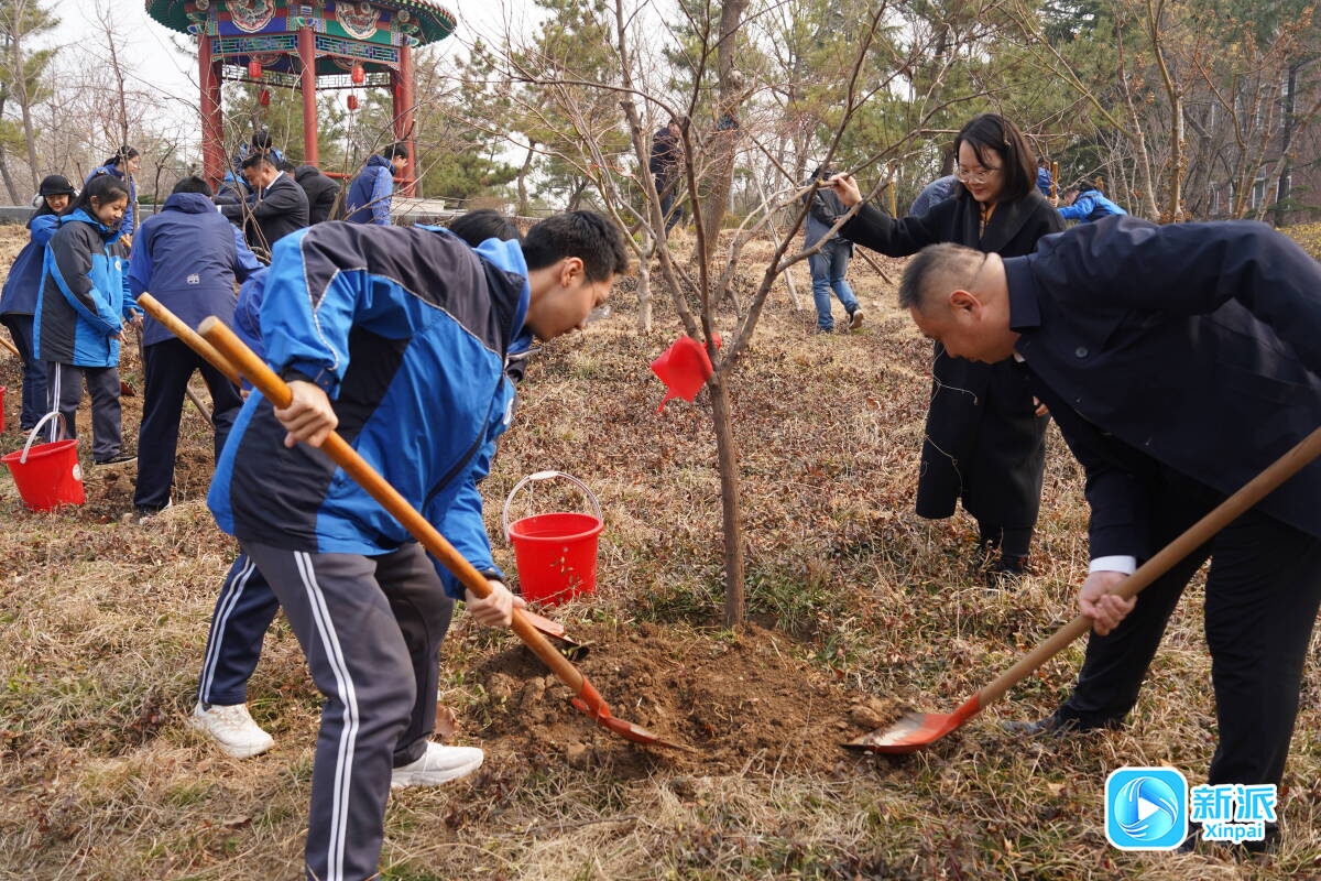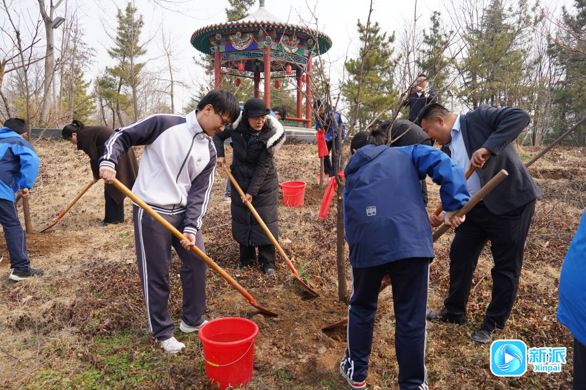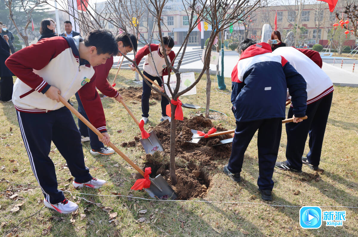 在潍坊一中,与会嘉宾、师生代表携手栽植树苗。