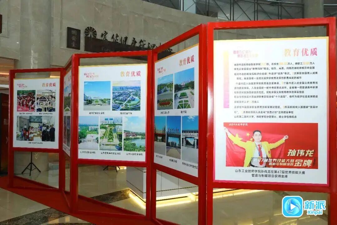 教育与文化展区,用校园建设、教学实践、人才培养成果等图片,搭配优质均衡发展县数量、职业院校技能大赛成绩、国家“双高计划”院校数量等数据,展现潍坊基础教育、职业教育、高等教育协同发展的良好态势。