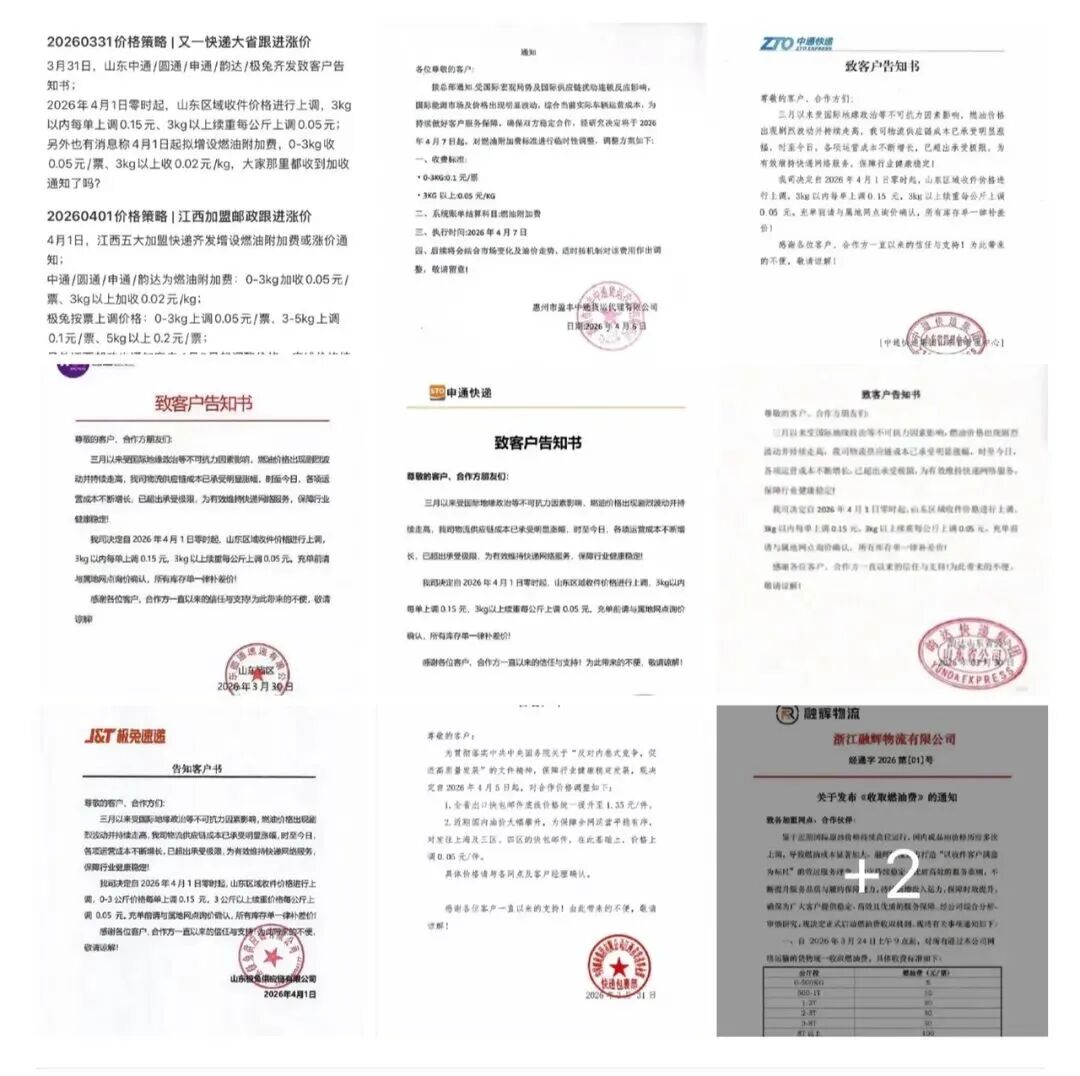 关于此次调价,多家加盟制快递公司在其发布的“告客户通知书”中均指出,近期燃油价格剧烈波动并持续走高,导致公司物流供应链成本显著增加。为应对运营成本压力,各公司决定对快递收件价格进行调整。以山东区域为例,中通、圆通、申通、韵达等公司已同步宣布,自4月1日起,3公斤以内的快件每单上调0.15元,3公斤以上的续重部分则按每公斤0.05元的标准加收。
