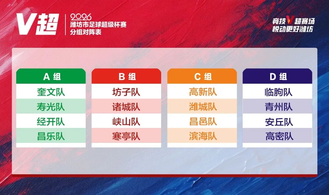 随后,在全场人员共同的见证下,根据《2026年潍坊市足球超级杯赛竞赛规程》要求进行了本届“V超”抽签仪式。最终抽签分组结果如下: