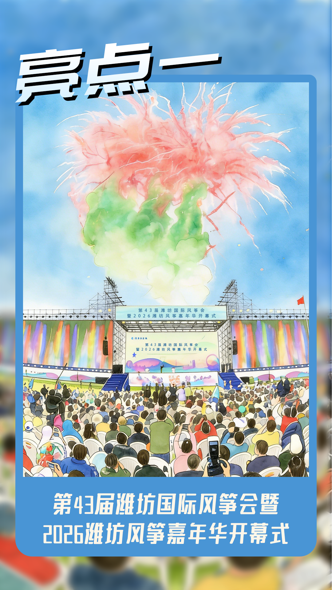 第43届潍坊国际风筝会暨2026潍坊风筝嘉年华精彩来袭!开幕式震撼、世界级放飞比赛、万人同飞、国际演出、美食挑战、望天+御风巡游、风筝市集、潮流表演、咖啡美食等亮点轮番登场。