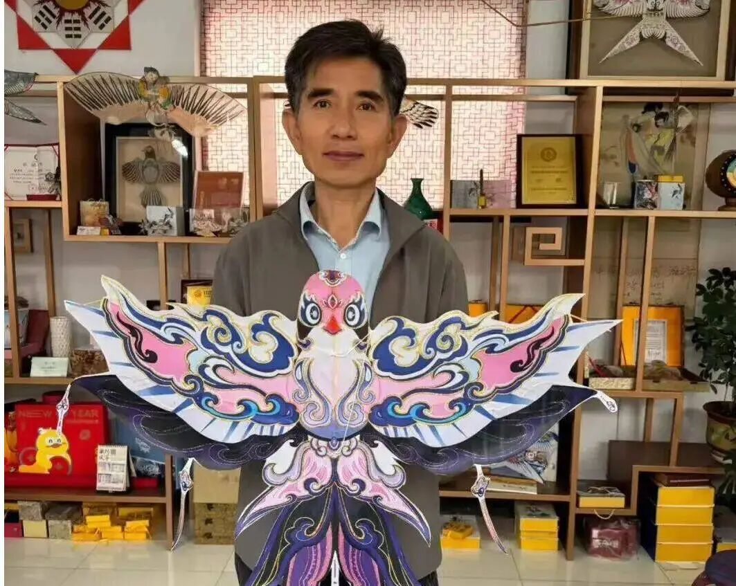 郭洪利展示与“超自然行动组”手游合作的风筝。(图源:文明潍坊)